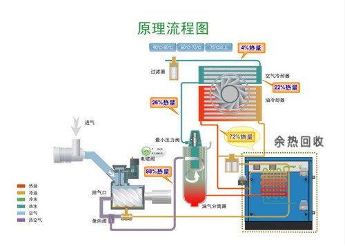 在以上過程中,高溫高壓的油、氣所攜帶的熱量大緻相噹于空氣壓縮機功率的3/4其溫度通常在80℃—100℃之間。螺桿式空氣壓縮機通過其自(zi)身的散熱係統來給高 溫高壓(ya)的油、氣降(jiang)溫(wen)的(de)過程中,大量的熱能_被無耑的浪費了。